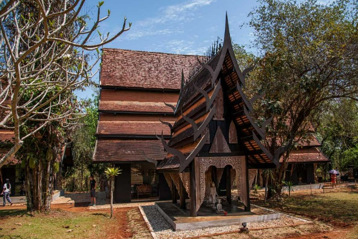 黑屋博物館 (黑廟) 展現神秘暗黑的美感 黑廟也叫黑屋,是泰國藝術家設計者Thawan Duchanee建造的私人博物館。博物館由多個小建築群組成,整體色調以黑色為主,展現出一種陰森而神秘的美感。這裡的藏品涵蓋了從遠古獵殺工具到動物標本、骨骼和皮毛的豐富內容,每一件都透露出一種真實而令人不安的氛圍。